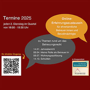 „Welche ersten Schritte muss ich nach einer Betreuungsübernahme beachten? Wie erstelle ich eine Rechnungslegung oder Vermögensverzeichnis für das Amtsgericht? Muss ich als Betreuer*in immer erreichbar sein? Wie gehe ich mit Konfliktsituationen um?“- Sie bestimmen mit Ihren Fragen die Inhalte des BTV Talks! Nutzen Sie den Austausch mit anderen Ehrenamtlichen und lernen Sie aus deren Erfahrungen.